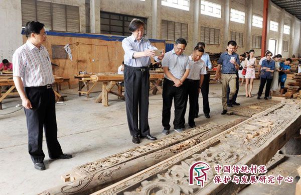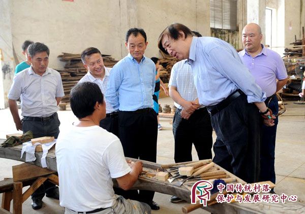 7月17日上午,冯骥才考察蚌埠古民居博览园的修复工厂,与木雕师傅深入交流