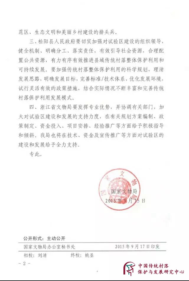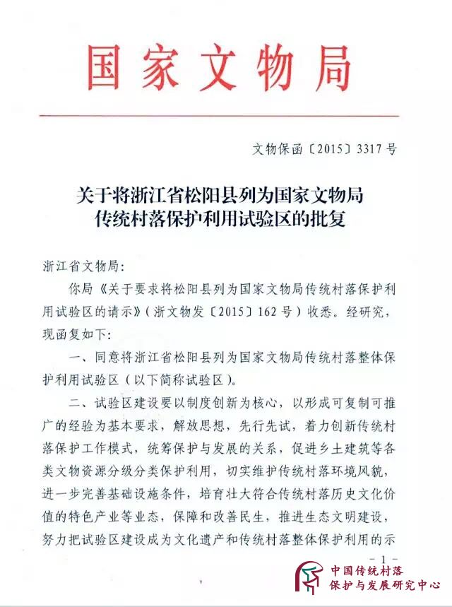 据文物保函【2015】3317号,国家文物局于2015年9月15日正式批复将松阳县列为传统村落整体保护利用试验区。