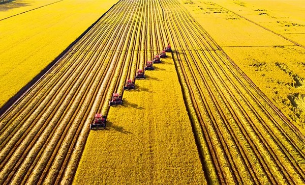 ▲机械化是提升农业综合生产能力的重要措施。作为中国农业现代化的排头兵,黑龙江北大荒集团目前已实现机械化全覆盖,正在积极探索信息化、智能化农业发展的崭新路径。图为2021年8月29日,在北大荒集团江川农场有限公司稻田中,自走式割晒机正进行割晒作业。人民图片 刘帅冶/摄