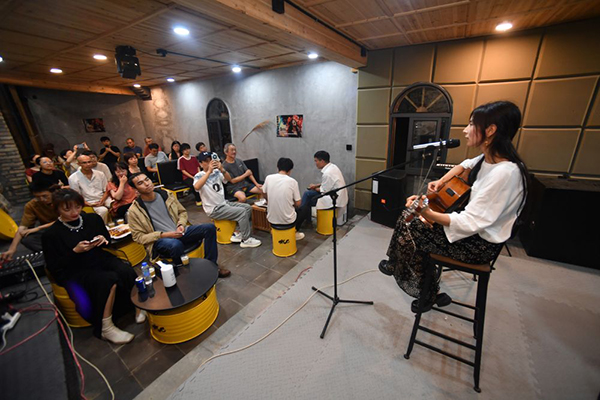8月29日,龙潭村音乐吧内,部分“新村民”及游客在交流原创音乐。