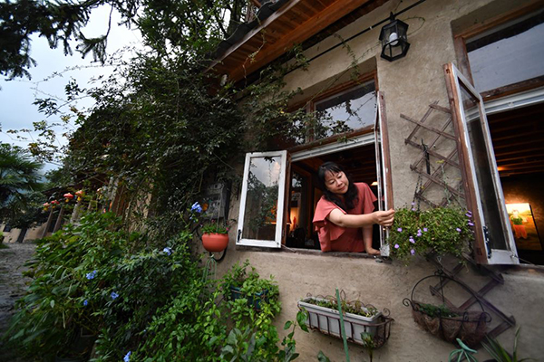8月29日,龙潭村“新村民”梅宏在打理自己经营的民宿窗外的盆花。