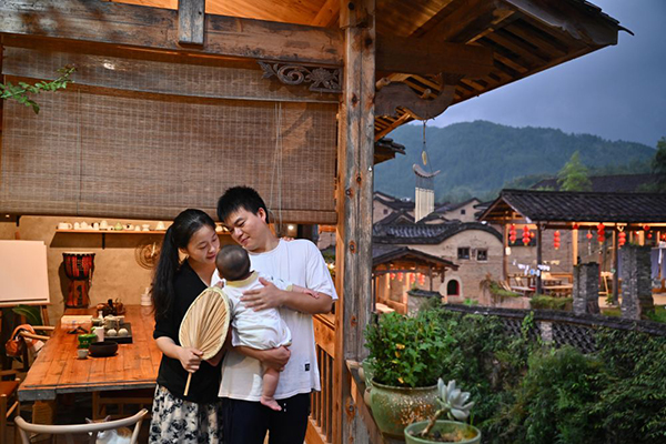8月29日,龙潭村“新村民”温怀德夫妇在自己经营的民宿内与孩子享受休闲时光。