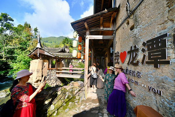 8月30日,游客在龙潭村游玩拍照。